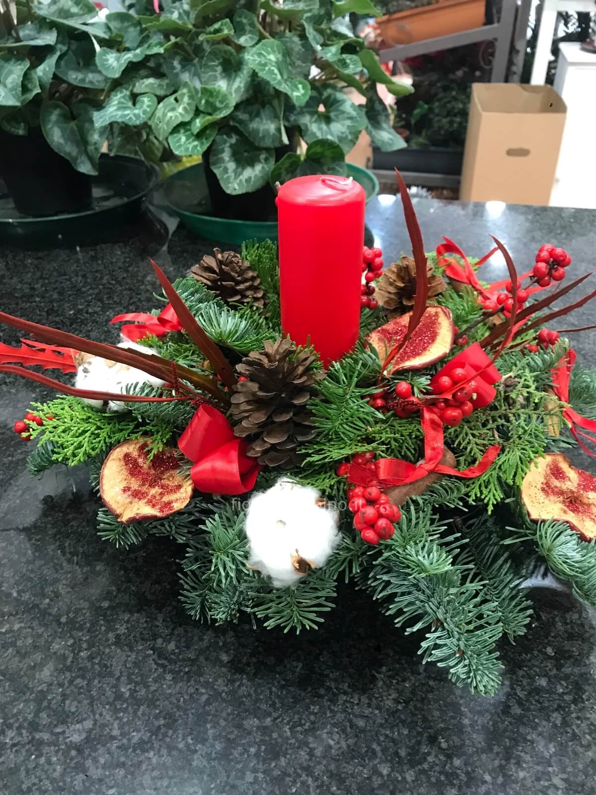 | Centrotavola natalizio rosso, con candel, bacche e abete. Cod. 84752 |